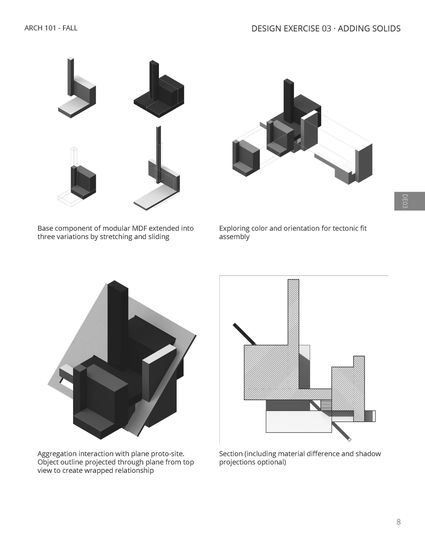 The semester is divided into three parts: (1) a dense six-week technique learning phase of Design Exercises, which increase in complexity but repeat common themes of adding parts and dividing wholes with shapes; (2) a 1-2 week midterm curation phase where students analyze and reflect on what they are learning to organize their work into two Design Approaches that include 2D and 3D elements as coherent visual systems; and (3) a six-week final project where they test their understanding of elements and rules as a way of designing a hybrid visual system as a proto-architectural proposal on an abstract site. During this process, students learn to frame and reframe, their design decisions and strategies within the two primary contexts of additive and subdivision systems that work with shapes and rules.