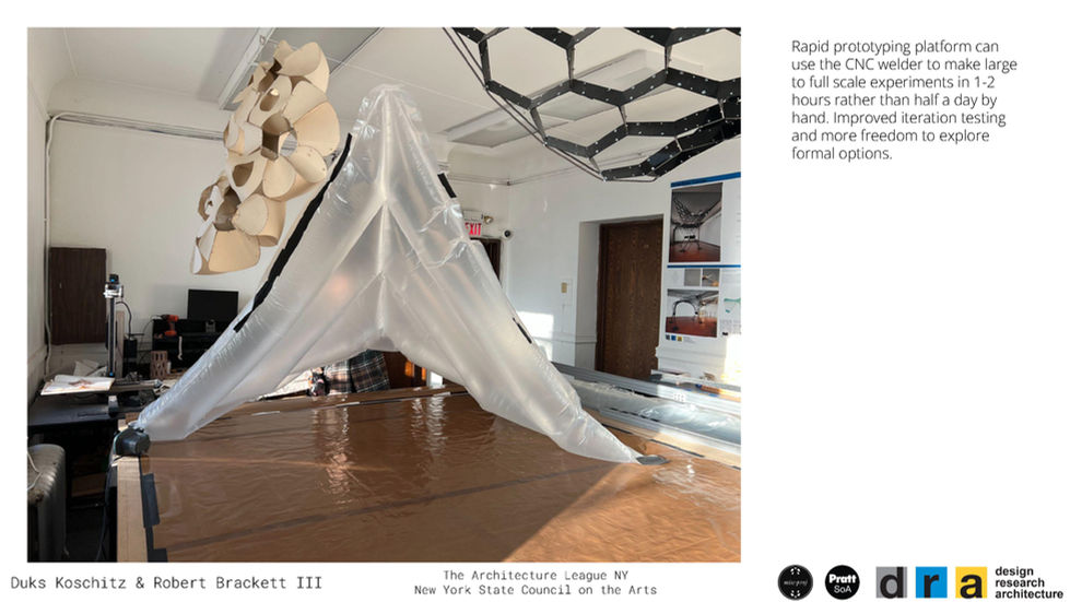 d.r.a. Lab research into self-forming 2D patterns that create 3D pneumatic structures that can be used as formwork for concrete casting was presented at the 2023 Pratt Research Open House in the Pratt Research Yard. Funding for the materials and equipment was provided by Pratt's Faculty Development Fund and the Architecture League and the NYSCA.